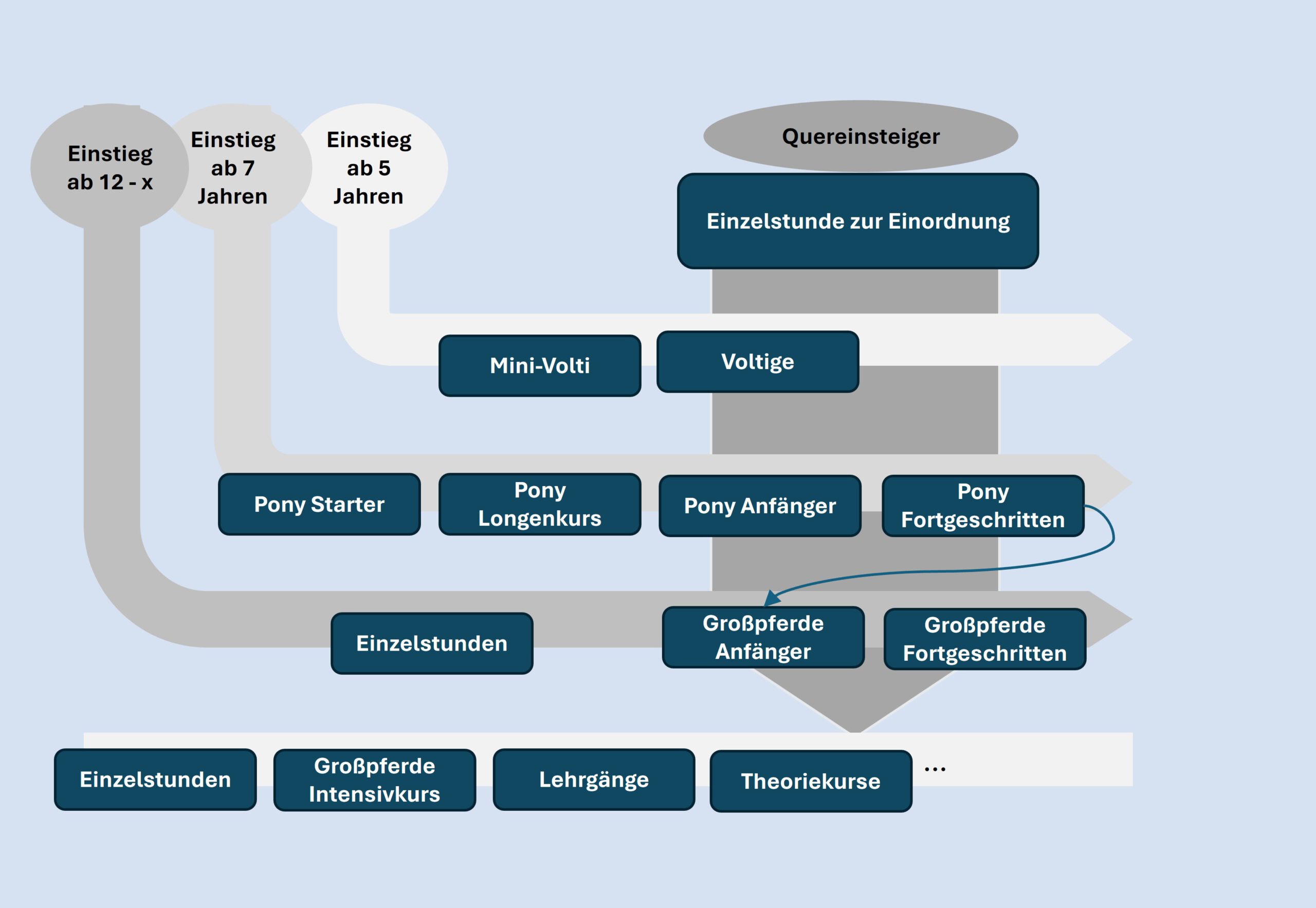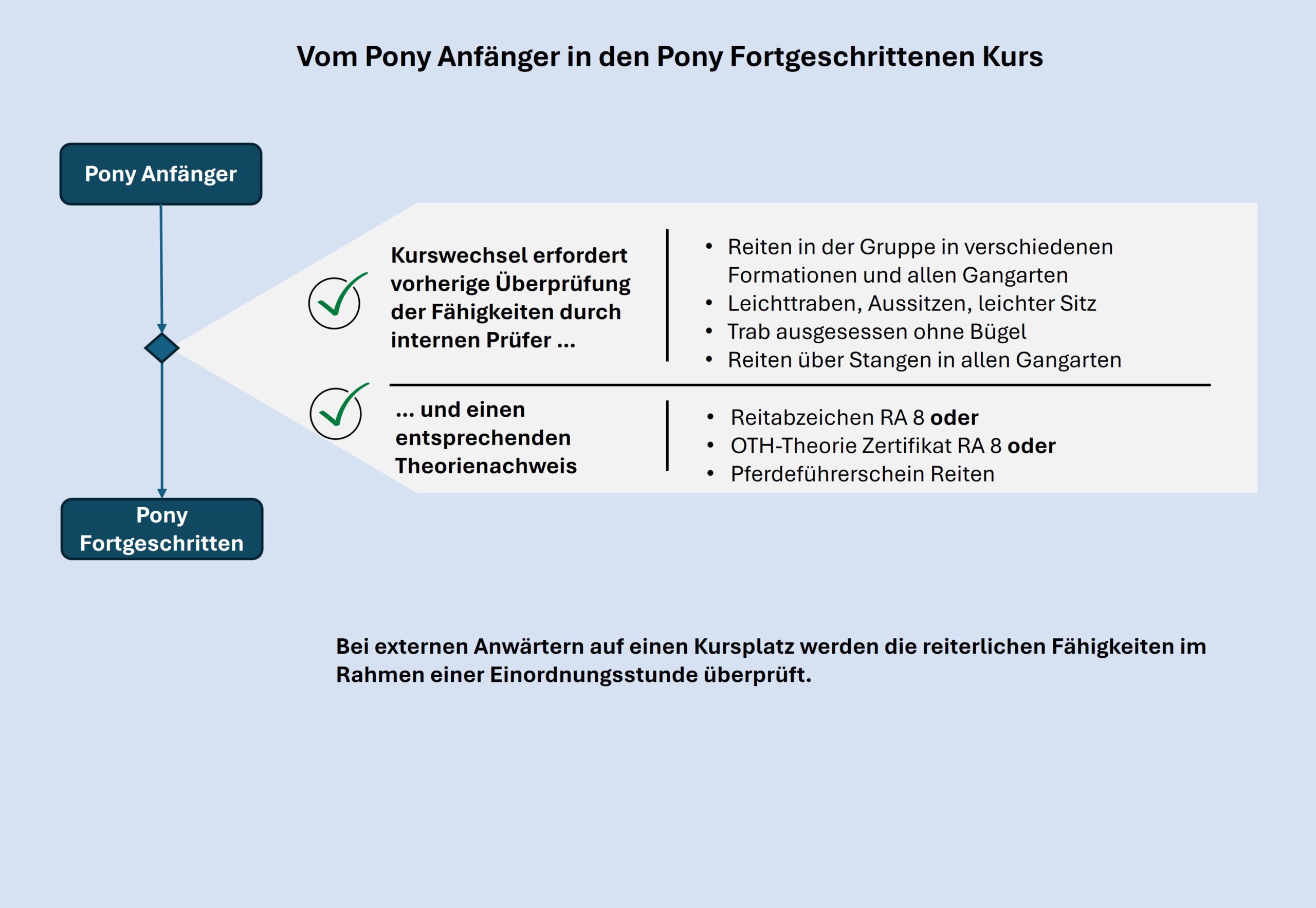 Dazu ist es erforderlich, die Kenntnisse der Teilnehmer dann zu überprüfen, wenn sie gerne in den nächsthöheren Kurs wechseln möchten. Dies zeigt die folgende Darstellung am Beispiel der Ponykurse.